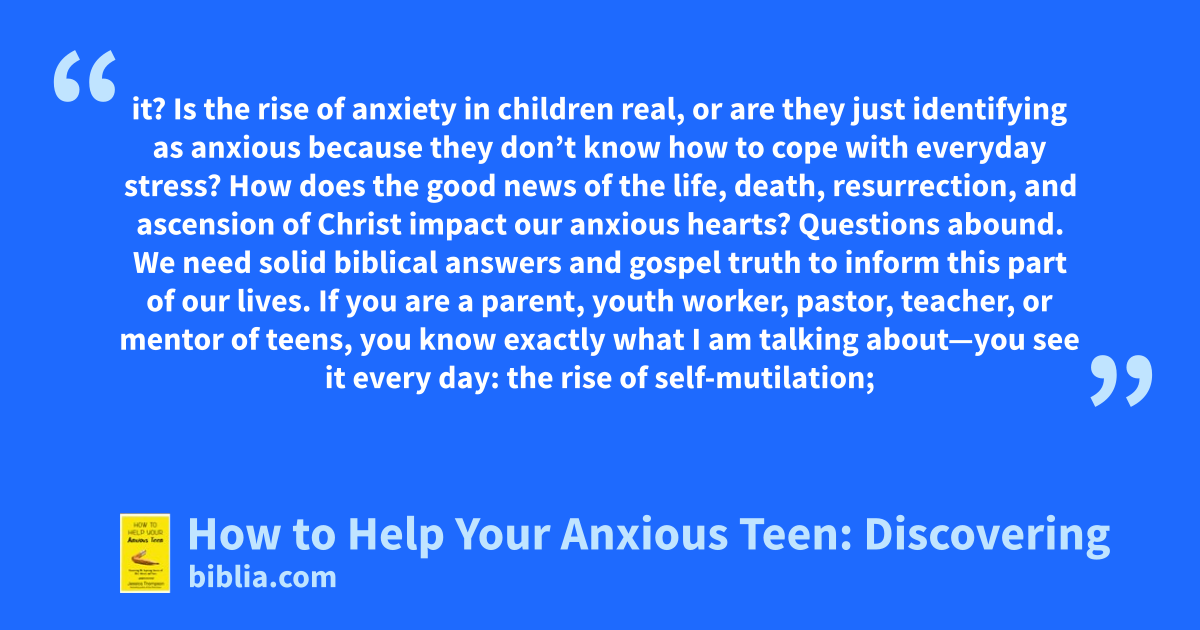 it? Is the rise of anxiety in children real, or are they just identifying as anxious because they don’t know how to cope with everyday stress? How does the good news of the life, death, resurrection, and ascension of Christ impact our anxious hearts? Questions abound. We need solid biblical answers and gospel truth to inform this part of our lives. If you are a parent, youth worker, pastor, teacher, or mentor of teens, you know exactly what I am talking about—you see it every day: the rise of self-mutilation;