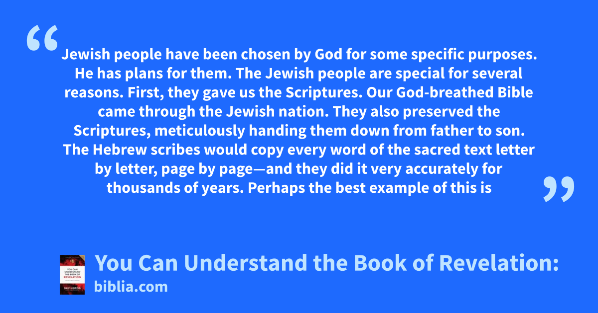 Jewish people have been chosen by God for some specific purposes. He has plans for them. The Jewish people are special for several reasons. First, they gave us the Scriptures. Our God-breathed Bible came through the Jewish nation. They also preserved the Scriptures, meticulously handing them down from father to son. The Hebrew scribes would copy every word of the sacred text letter by letter, page by page—and they did it very accurately for thousands of years. Perhaps the best example of this is