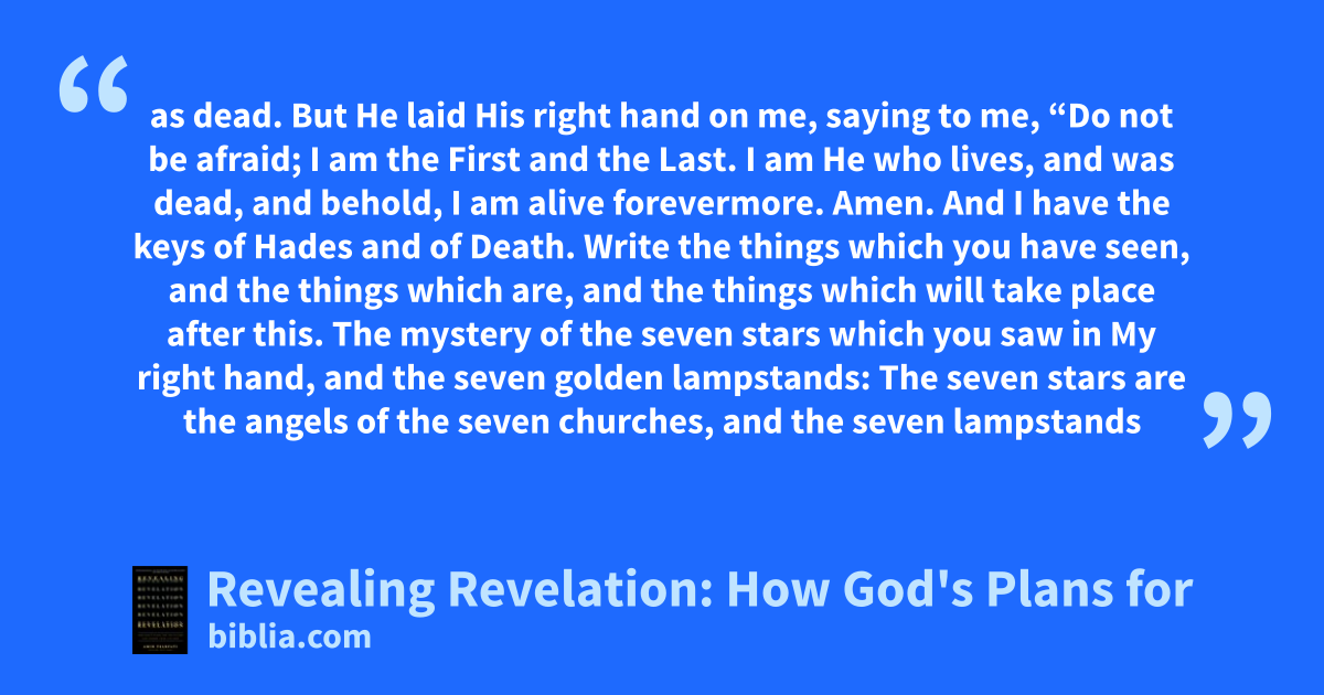as dead. But He laid His right hand on me, saying to me, “Do not be afraid; I am the First and the Last. I am He who lives, and was dead, and behold, I am alive forevermore. Amen. And I have the keys of Hades and of Death. Write the things which you have seen, and the things which are, and the things which will take place after this. The mystery of the seven stars which you saw in My right hand, and the seven golden lampstands: The seven stars are the angels of the seven churches, and the seven lampstands