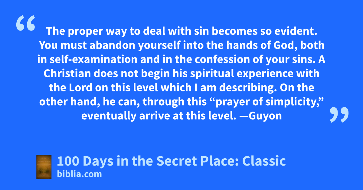 The proper way to deal with sin becomes so evident. You must abandon yourself into the hands of God, both in self-examination and in the confession of your sins. A Christian does not begin his spiritual experience with the Lord on this level which I am describing. On the other hand, he can, through this “prayer of simplicity,” eventually arrive at this level. —Guyon