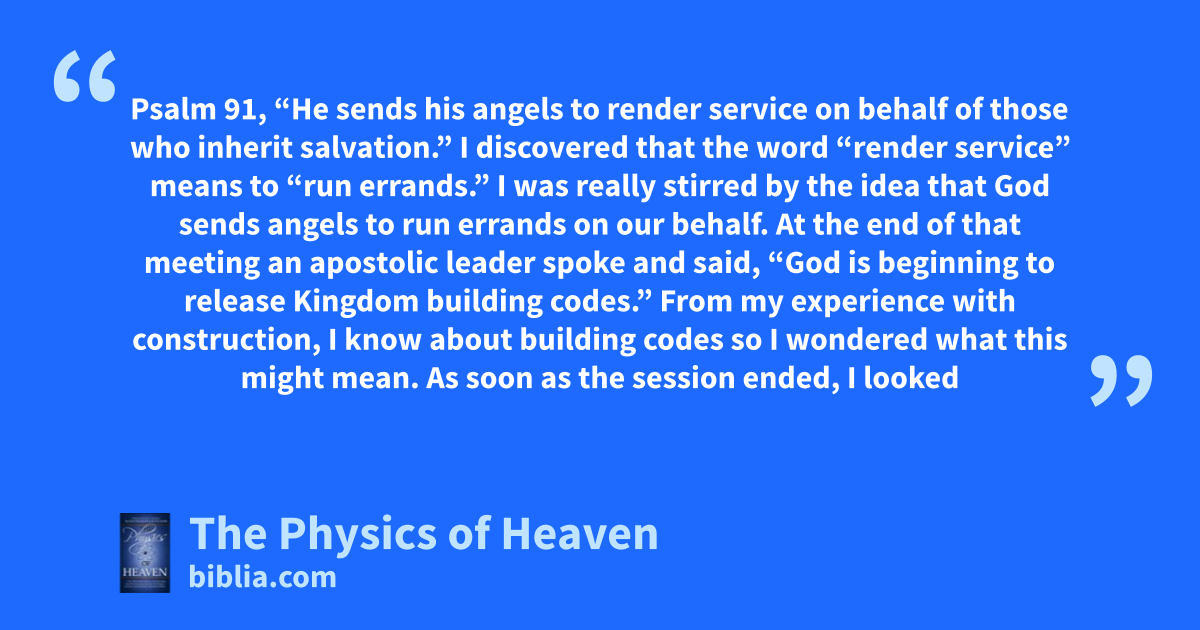 Psalm 91, “He sends his angels to render service on behalf of those who inherit salvation.” I discovered that the word “render service” means to “run errands.” I was really stirred by the idea that God sends angels to run errands on our behalf. At the end of that meeting an apostolic leader spoke and said, “God is beginning to release Kingdom building codes.” From my experience with construction, I know about building codes so I wondered what this might mean. As soon as the session ended, I looked