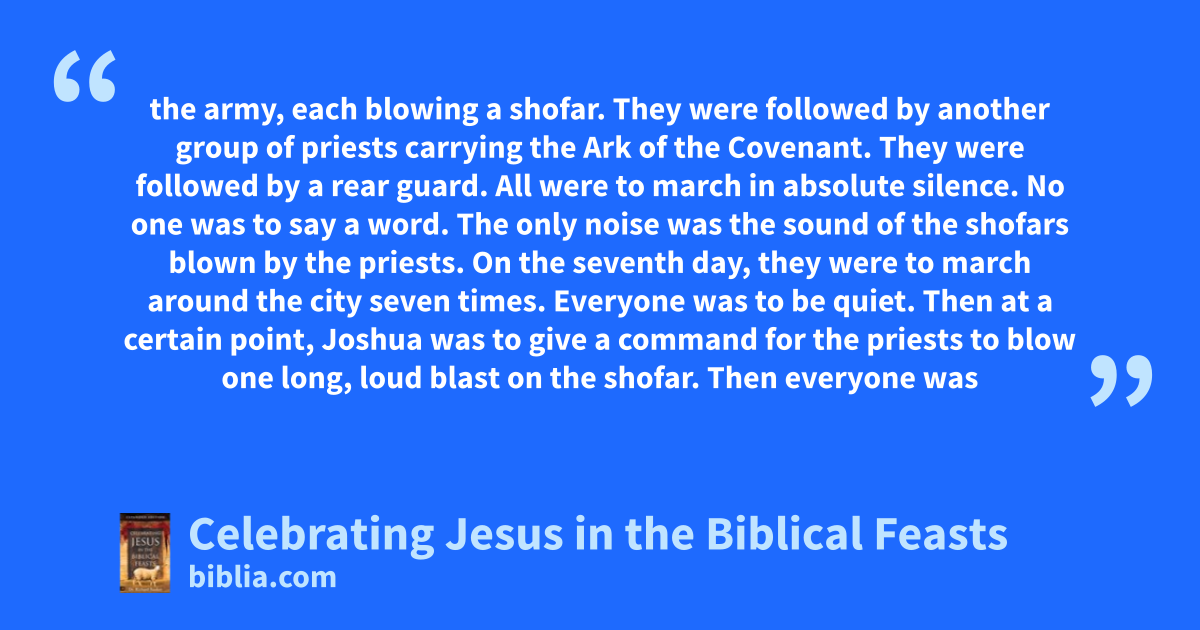 the army, each blowing a shofar. They were followed by another group of priests carrying the Ark of the Covenant. They were followed by a rear guard. All were to march in absolute silence. No one was to say a word. The only noise was the sound of the shofars blown by the priests. On the seventh day, they were to march around the city seven times. Everyone was to be quiet. Then at a certain point, Joshua was to give a command for the priests to blow one long, loud blast on the shofar. Then everyone was