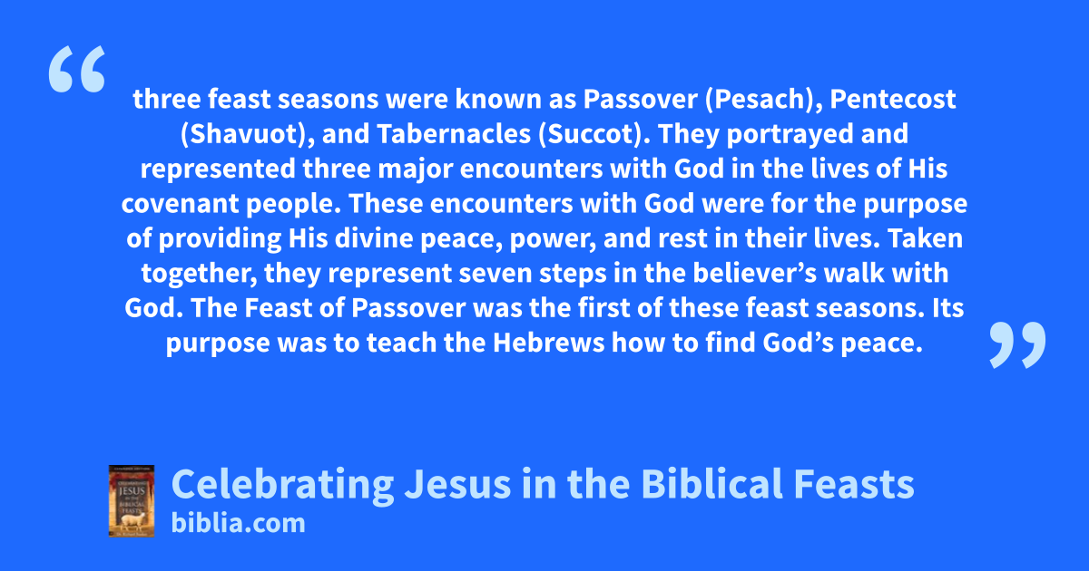 three feast seasons were known as Passover (Pesach), Pentecost (Shavuot), and Tabernacles (Succot). They portrayed and represented three major encounters with God in the lives of His covenant people. These encounters with God were for the purpose of providing His divine peace, power, and rest in their lives. Taken together, they represent seven steps in the believer’s walk with God. The Feast of Passover was the first of these feast seasons. Its purpose was to teach the Hebrews how to find God’s peace.