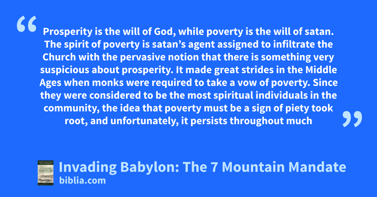 Prosperity is the will of God, while poverty is the will of satan. The spirit of poverty is satan’s agent assigned to infiltrate the Church with the pervasive notion that there is something very suspicious about prosperity. It made great strides in the Middle Ages when monks were required to take a vow of poverty. Since they were considered to be the most spiritual individuals in the community, the idea that poverty must be a sign of piety took root, and unfortunately, it persists throughout much