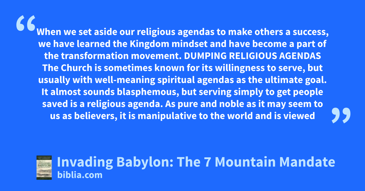 When we set aside our religious agendas to make others a success, we have learned the Kingdom mindset and have become a part of the transformation movement. DUMPING RELIGIOUS AGENDAS The Church is sometimes known for its willingness to serve, but usually with well-meaning spiritual agendas as the ultimate goal. It almost sounds blasphemous, but serving simply to get people saved is a religious agenda. As pure and noble as it may seem to us as believers, it is manipulative to the world and is viewed