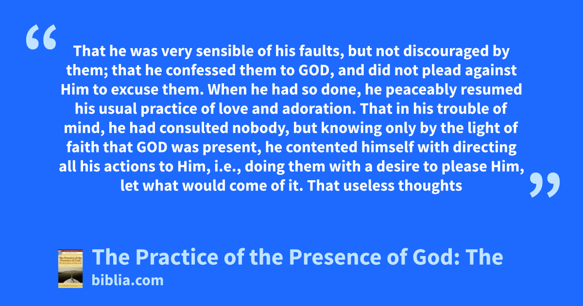 That he was very sensible of his faults, but not discouraged by them; that he confessed them to GOD, and did not plead against Him to excuse them. When he had so done, he peaceably resumed his usual practice of love and adoration. That in his trouble of mind, he had consulted nobody, but knowing only by the light of faith that GOD was present, he contented himself with directing all his actions to Him, i.e., doing them with a desire to please Him, let what would come of it. That useless thoughts