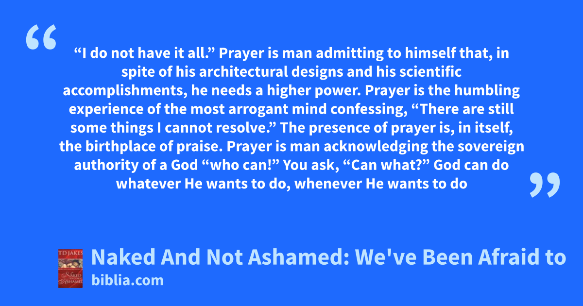 “I do not have it all.” Prayer is man admitting to himself that, in spite of his architectural designs and his scientific accomplishments, he needs a higher power. Prayer is the humbling experience of the most arrogant mind confessing, “There are still some things I cannot resolve.” The presence of prayer is, in itself, the birthplace of praise. Prayer is man acknowledging the sovereign authority of a God “who can!” You ask, “Can what?” God can do whatever He wants to do, whenever He wants to do