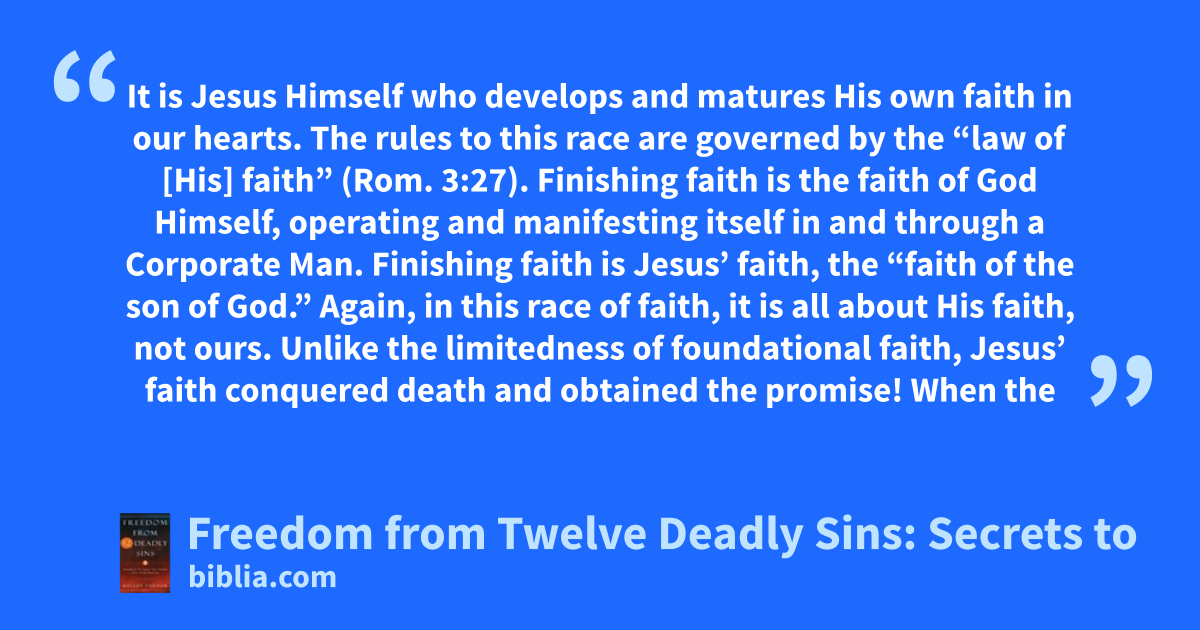 It is Jesus Himself who develops and matures His own faith in our hearts. The rules to this race are governed by the “law of [His] faith” (Rom. 3:27). Finishing faith is the faith of God Himself, operating and manifesting itself in and through a Corporate Man. Finishing faith is Jesus’ faith, the “faith of the son of God.” Again, in this race of faith, it is all about His faith, not ours. Unlike the limitedness of foundational faith, Jesus’ faith conquered death and obtained the promise! When the