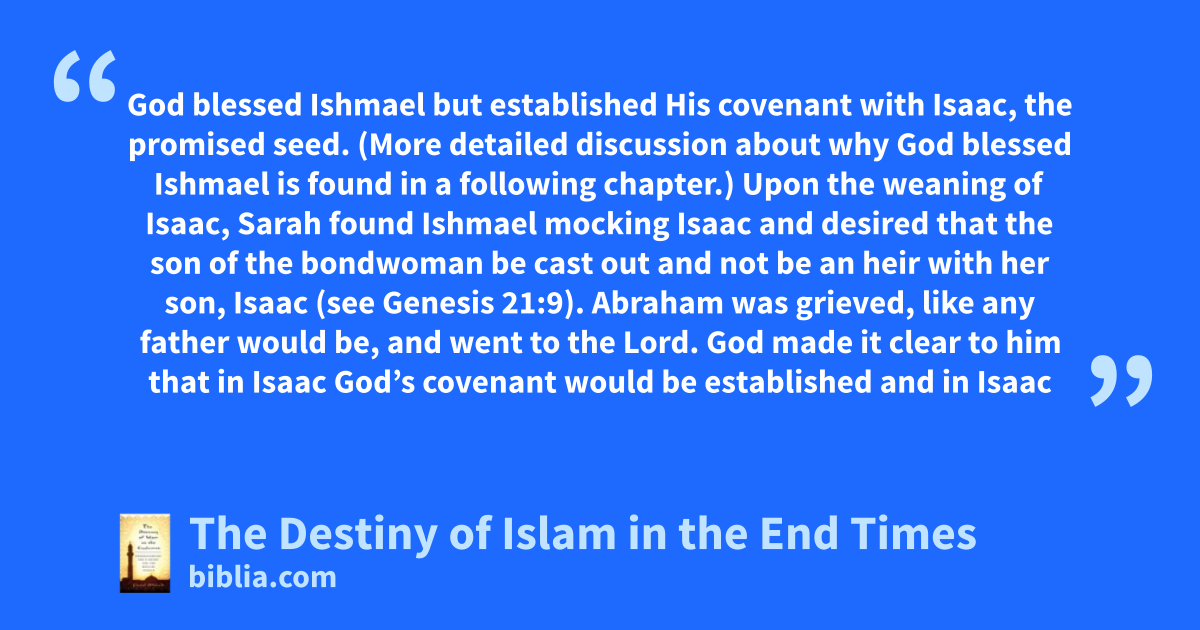 God blessed Ishmael but established His covenant with Isaac, the promised seed. (More detailed discussion about why God blessed Ishmael is found in a following chapter.) Upon the weaning of Isaac, Sarah found Ishmael mocking Isaac and desired that the son of the bondwoman be cast out and not be an heir with her son, Isaac (see Genesis 21:9). Abraham was grieved, like any father would be, and went to the Lord. God made it clear to him that in Isaac God’s covenant would be established and in Isaac