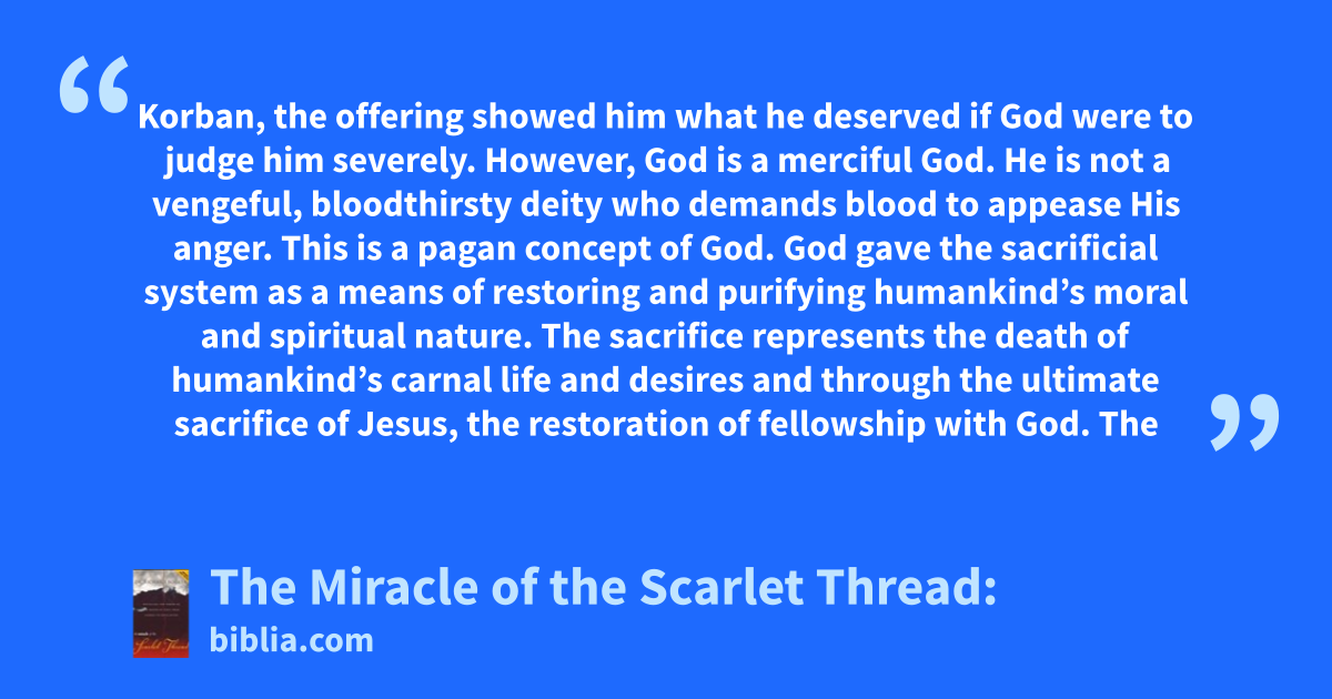 Korban, the offering showed him what he deserved if God were to judge him severely. However, God is a merciful God. He is not a vengeful, bloodthirsty deity who demands blood to appease His anger. This is a pagan concept of God. God gave the sacrificial system as a means of restoring and purifying humankind’s moral and spiritual nature. The sacrifice represents the death of humankind’s carnal life and desires and through the ultimate sacrifice of Jesus, the restoration of fellowship with God. The