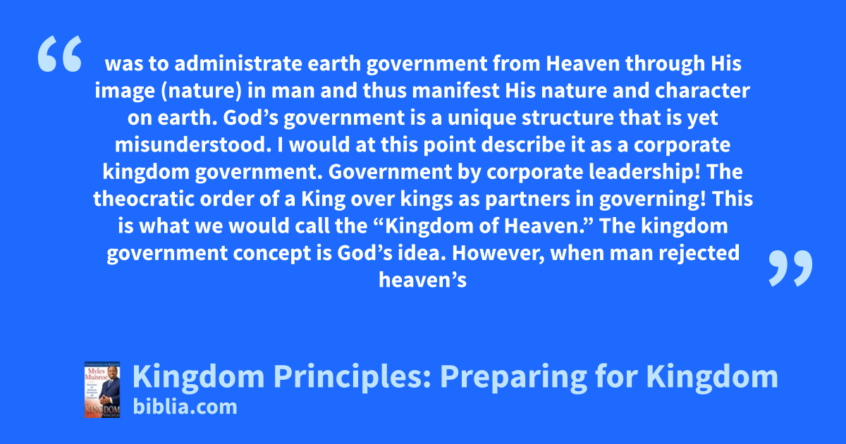 was to administrate earth government from Heaven through His image (nature) in man and thus manifest His nature and character on earth. God’s government is a unique structure that is yet misunderstood. I would at this point describe it as a corporate kingdom government. Government by corporate leadership! The theocratic order of a King over kings as partners in governing! This is what we would call the “Kingdom of Heaven.” The kingdom government concept is God’s idea. However, when man rejected heaven’s
