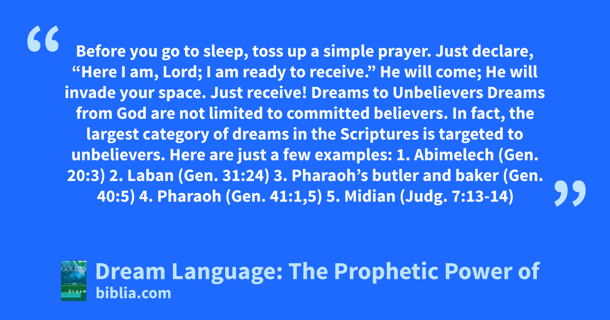 Before you go to sleep, toss up a simple prayer. Just declare, “Here I am, Lord; I am ready to receive.” He will come; He will invade your space. Just receive! Dreams to Unbelievers Dreams from God are not limited to committed believers. In fact, the largest category of dreams in the Scriptures is targeted to unbelievers. Here are just a few examples: 1. Abimelech (Gen. 20:3) 2. Laban (Gen. 31:24) 3. Pharaoh’s butler and baker (Gen. 40:5) 4. Pharaoh (Gen. 41:1,5) 5. Midian (Judg. 7:13-14)