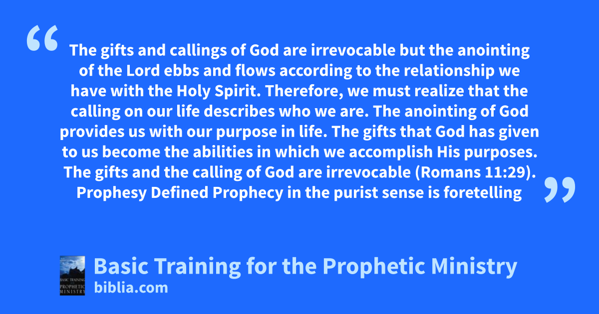 The gifts and callings of God are irrevocable but the anointing of the Lord ebbs and flows according to the relationship we have with the Holy Spirit. Therefore, we must realize that the calling on our life describes who we are. The anointing of God provides us with our purpose in life. The gifts that God has given to us become the abilities in which we accomplish His purposes. The gifts and the calling of God are irrevocable (Romans 11:29). Prophesy Defined Prophecy in the purist sense is foretelling