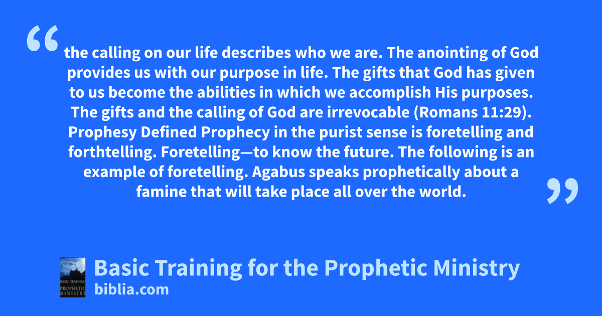 the calling on our life describes who we are. The anointing of God provides us with our purpose in life. The gifts that God has given to us become the abilities in which we accomplish His purposes. The gifts and the calling of God are irrevocable (Romans 11:29). Prophesy Defined Prophecy in the purist sense is foretelling and forthtelling. Foretelling—to know the future. The following is an example of foretelling. Agabus speaks prophetically about a famine that will take place all over the world.