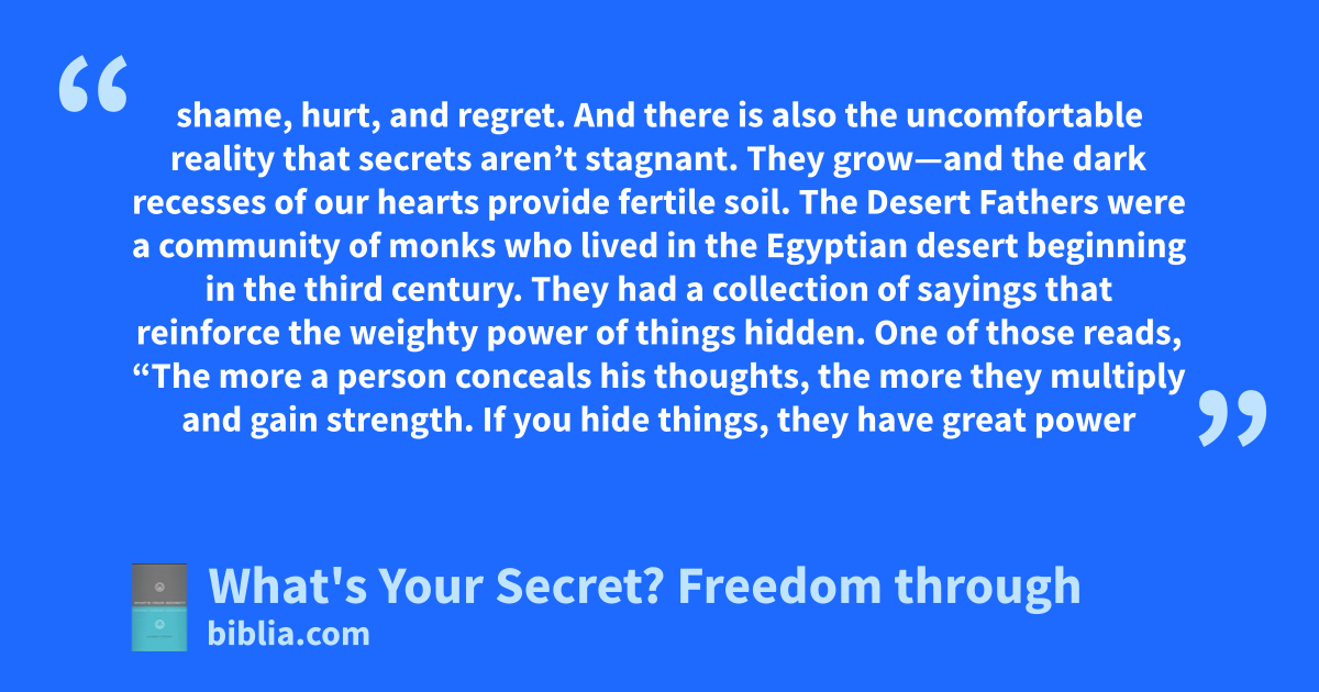 shame, hurt, and regret. And there is also the uncomfortable reality that secrets aren’t stagnant. They grow—and the dark recesses of our hearts provide fertile soil. The Desert Fathers were a community of monks who lived in the Egyptian desert beginning in the third century. They had a collection of sayings that reinforce the weighty power of things hidden. One of those reads, “The more a person conceals his thoughts, the more they multiply and gain strength. If you hide things, they have great power