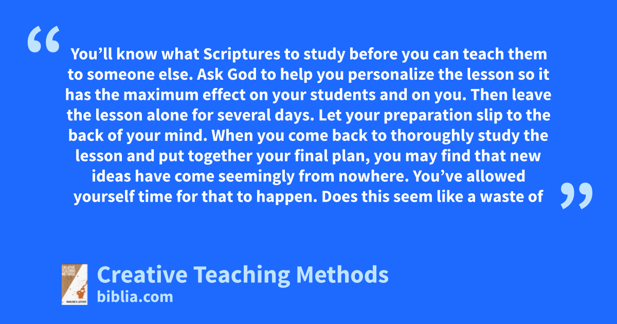 You’ll know what Scriptures to study before you can teach them to someone else. Ask God to help you personalize the lesson so it has the maximum effect on your students and on you. Then leave the lesson alone for several days. Let your preparation slip to the back of your mind. When you come back to thoroughly study the lesson and put together your final plan, you may find that new ideas have come seemingly from nowhere. You’ve allowed yourself time for that to happen. Does this seem like a waste of