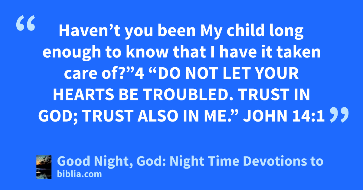 Haven’t you been My child long enough to know that I have it taken care of?”4   “DO NOT LET YOUR HEARTS BE TROUBLED. TRUST IN GOD; TRUST ALSO IN ME.” JOHN 14:1