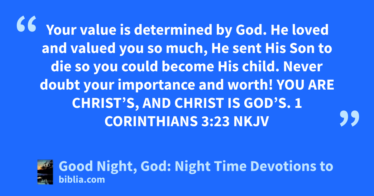 Your value is determined by God. He loved and valued you so much, He sent His Son to die so you could become His child. Never doubt your importance and worth!   YOU ARE CHRIST’S, AND CHRIST IS GOD’S. 1 CORINTHIANS 3:23 NKJV