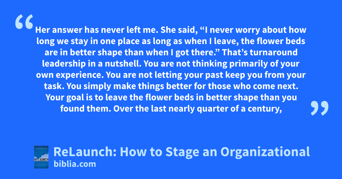 Her answer has never left me. She said, “I never worry about how long we stay in one place as long as when I leave, the flower beds are in better shape than when I got there.” That’s turnaround leadership in a nutshell. You are not thinking primarily of your own experience. You are not letting your past keep you from your task. You simply make things better for those who come next. Your goal is to leave the flower beds in better shape than you found them. Over the last nearly quarter of a century,