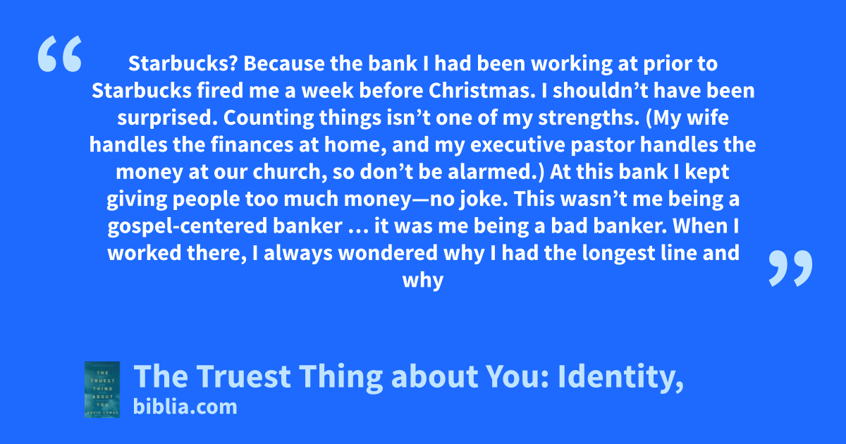 Starbucks? Because the bank I had been working at prior to Starbucks fired me a week before Christmas. I shouldn’t have been surprised. Counting things isn’t one of my strengths. (My wife handles the finances at home, and my executive pastor handles the money at our church, so don’t be alarmed.) At this bank I kept giving people too much money—no joke. This wasn’t me being a gospel-centered banker … it was me being a bad banker. When I worked there, I always wondered why I had the longest line and why
