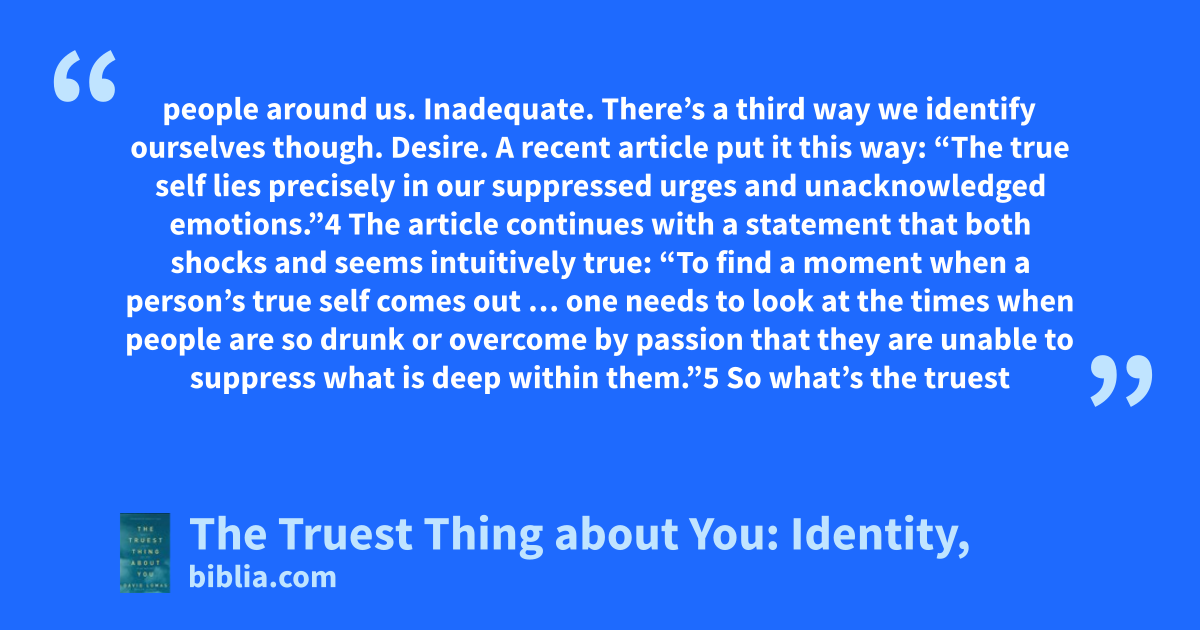 people around us. Inadequate. There’s a third way we identify ourselves though. Desire. A recent article put it this way: “The true self lies precisely in our suppressed urges and unacknowledged emotions.”4 The article continues with a statement that both shocks and seems intuitively true: “To find a moment when a person’s true self comes out … one needs to look at the times when people are so drunk or overcome by passion that they are unable to suppress what is deep within them.”5 So what’s the truest