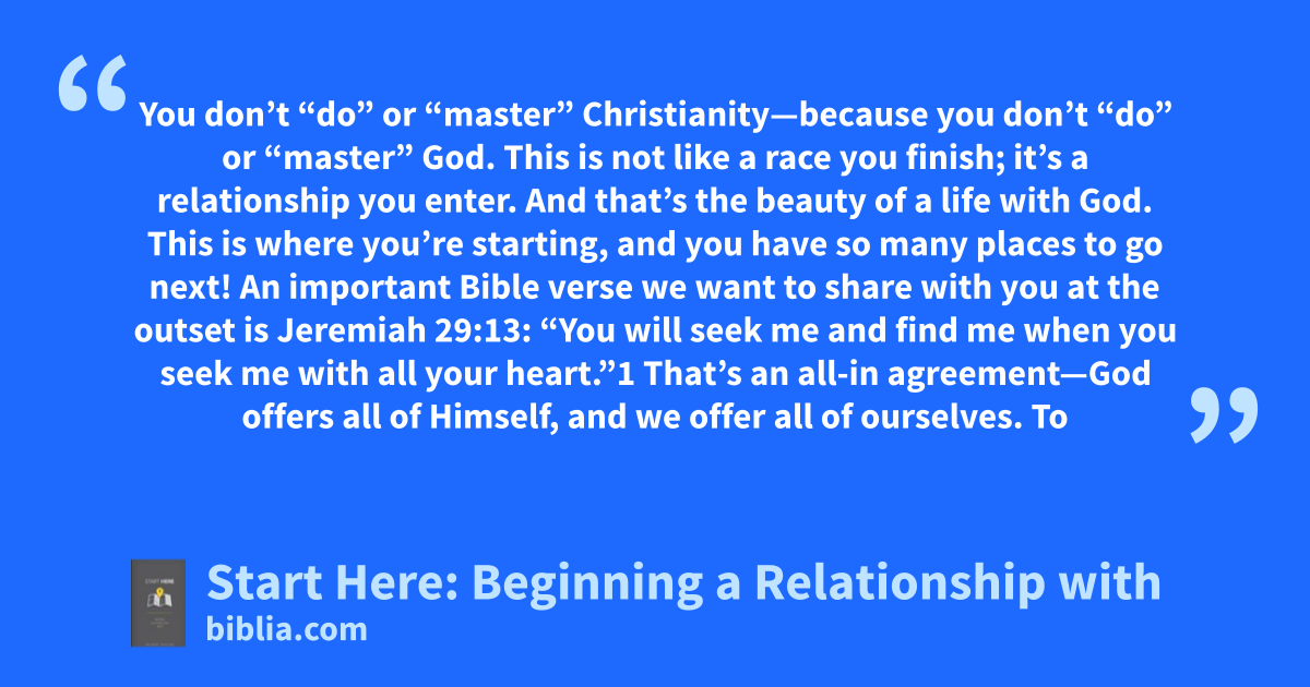 You don’t “do” or “master” Christianity—because you don’t “do” or “master” God. This is not like a race you finish; it’s a relationship you enter. And that’s the beauty of a life with God. This is where you’re starting, and you have so many places to go next! An important Bible verse we want to share with you at the outset is Jeremiah 29:13: “You will seek me and find me when you seek me with all your heart.”1 That’s an all-in agreement—God offers all of Himself, and we offer all of ourselves. To