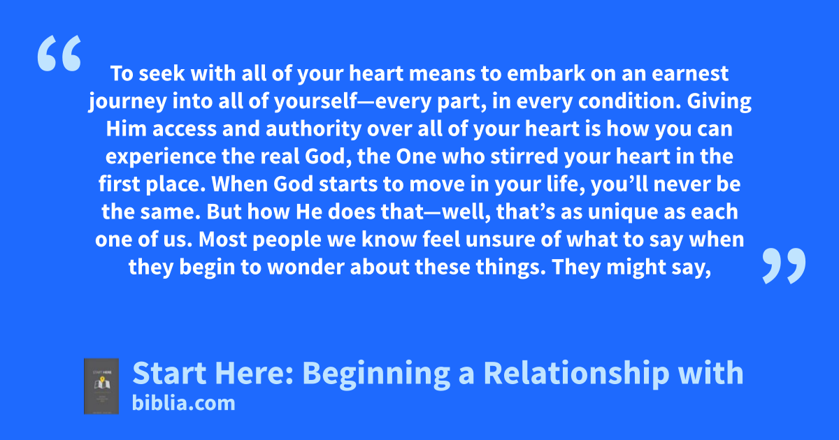To seek with all of your heart means to embark on an earnest journey into all of yourself—every part, in every condition. Giving Him access and authority over all of your heart is how you can experience the real God, the One who stirred your heart in the first place. When God starts to move in your life, you’ll never be the same. But how He does that—well, that’s as unique as each one of us. Most people we know feel unsure of what to say when they begin to wonder about these things. They might say,