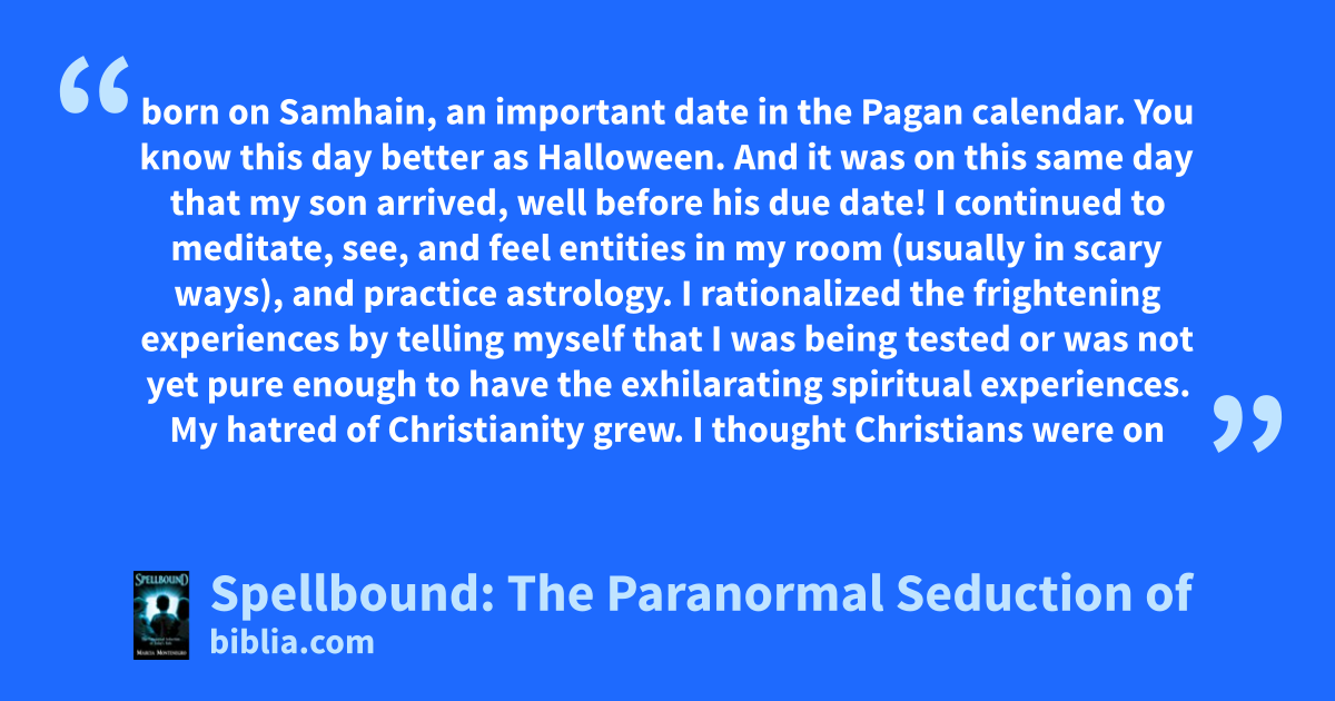 born on Samhain, an important date in the Pagan calendar. You know this day better as Halloween. And it was on this same day that my son arrived, well before his due date! I continued to meditate, see, and feel entities in my room (usually in scary ways), and practice astrology. I rationalized the frightening experiences by telling myself that I was being tested or was not yet pure enough to have the exhilarating spiritual experiences. My hatred of Christianity grew. I thought Christians were on