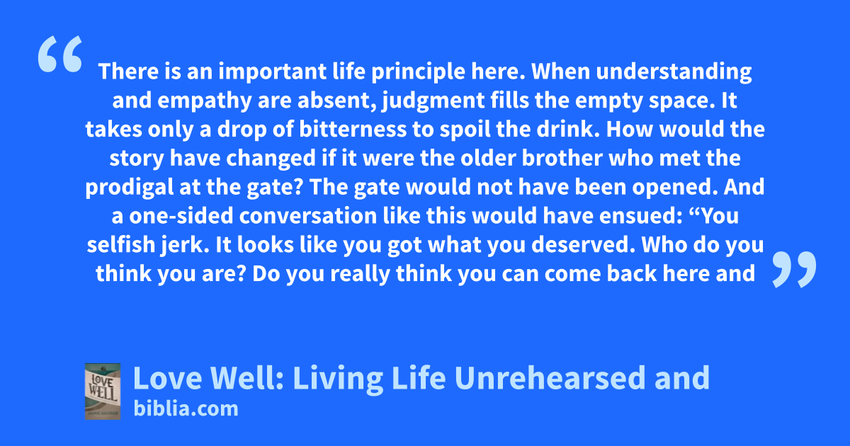 There is an important life principle here. When understanding and empathy are absent, judgment fills the empty space. It takes only a drop of bitterness to spoil the drink. How would the story have changed if it were the older brother who met the prodigal at the gate? The gate would not have been opened. And a one-sided conversation like this would have ensued: “You selfish jerk. It looks like you got what you deserved. Who do you think you are? Do you really think you can come back here and