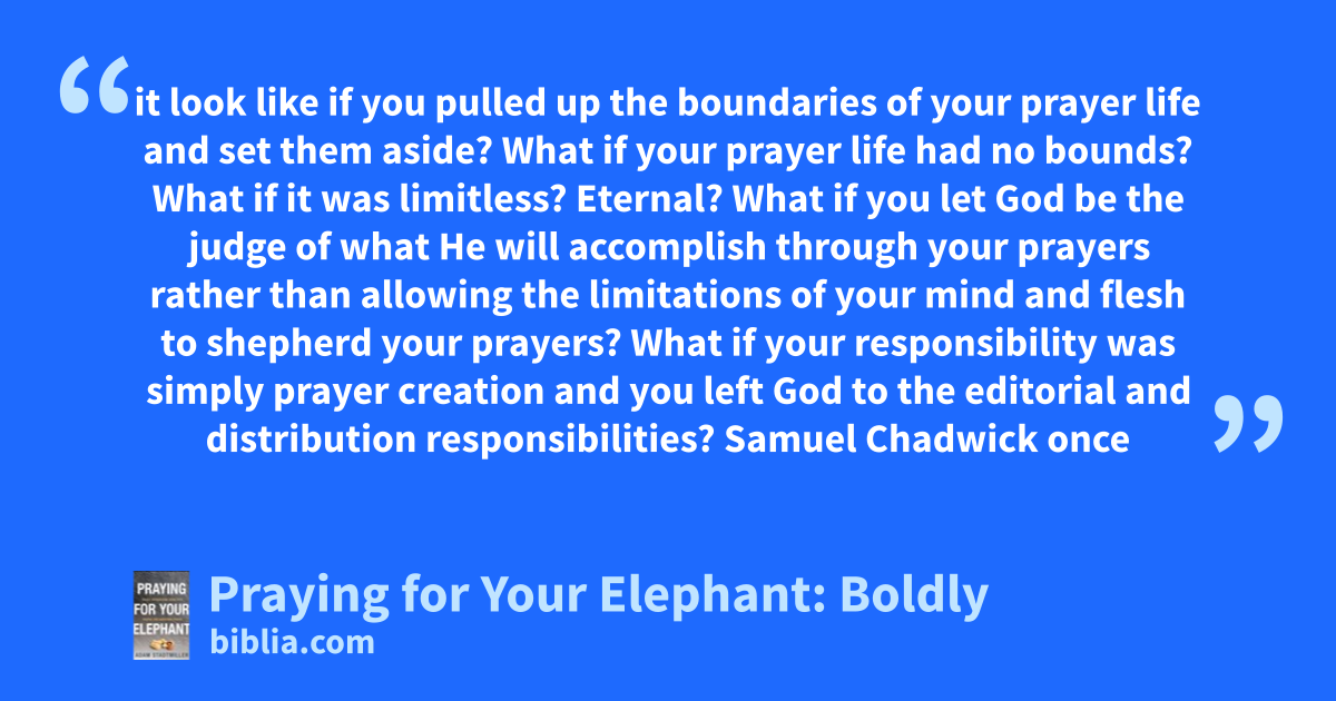 it look like if you pulled up the boundaries of your prayer life and set them aside? What if your prayer life had no bounds? What if it was limitless? Eternal? What if you let God be the judge of what He will accomplish through your prayers rather than allowing the limitations of your mind and flesh to shepherd your prayers? What if your responsibility was simply prayer creation and you left God to the editorial and distribution responsibilities? Samuel Chadwick once