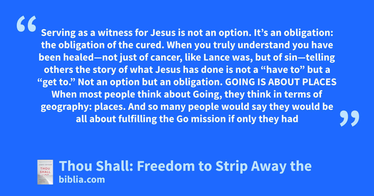 Serving as a witness for Jesus is not an option. It’s an obligation: the obligation of the cured. When you truly understand you have been healed—not just of cancer, like Lance was, but of sin—telling others the story of what Jesus has done is not a “have to” but a “get to.” Not an option but an obligation. GOING IS ABOUT PLACES When most people think about Going, they think in terms of geography: places. And so many people would say they would be all about fulfilling the Go mission if only they had