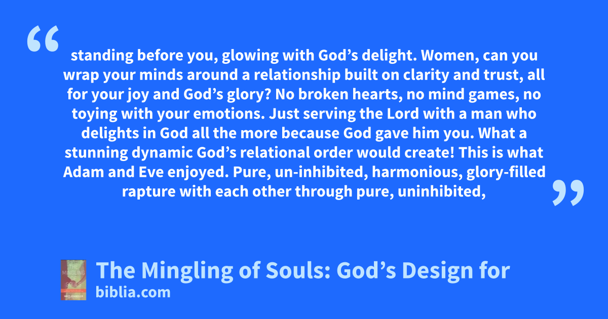 standing before you, glowing with God’s delight. Women, can you wrap your minds around a relationship built on clarity and trust, all for your joy and God’s glory? No broken hearts, no mind games, no toying with your emotions. Just serving the Lord with a man who delights in God all the more because God gave him you. What a stunning dynamic God’s relational order would create! This is what Adam and Eve enjoyed. Pure, un­inhibited, harmonious, glory-filled rapture with each other through pure, uninhibited,