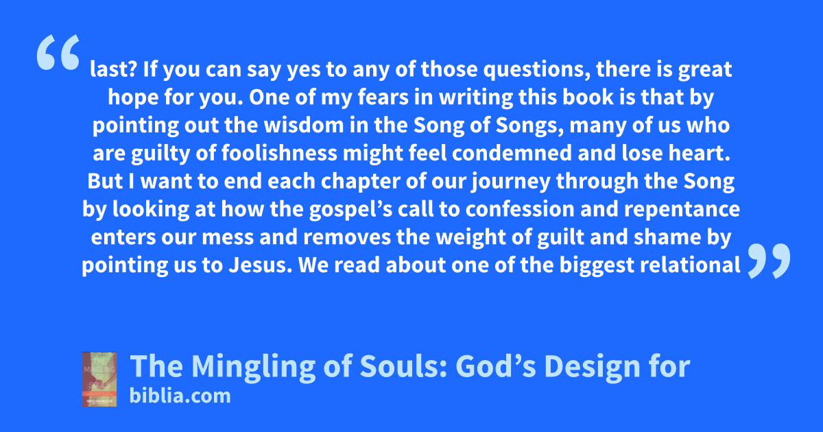 last? If you can say yes to any of those questions, there is great hope for you. One of my fears in writing this book is that by pointing out the wisdom in the Song of Songs, many of us who are guilty of foolishness might feel condemned and lose heart. But I want to end each chapter of our journey through the Song by looking at how the gospel’s call to confession and repentance enters our mess and removes the weight of guilt and shame by pointing us to Jesus. We read about one of the biggest relational