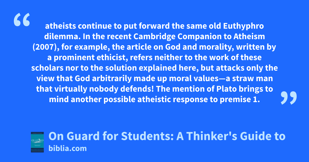 atheists continue to put forward the same old Euthyphro dilemma. In the recent Cambridge Companion to Atheism (2007), for example, the article on God and morality, written by a prominent ethicist, refers neither to the work of these scholars nor to the solution explained here, but attacks only the view that God arbitrarily made up moral values—a straw man that virtually nobody defends! The mention of Plato brings to mind another possible atheistic response to premise 1.