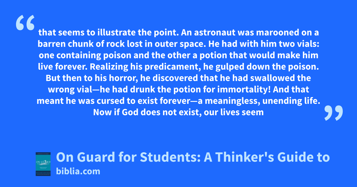 that seems to illustrate the point. An astronaut was marooned on a barren chunk of rock lost in outer space. He had with him two vials: one containing poison and the other a potion that would make him live forever. Realizing his predicament, he gulped down the poison. But then to his horror, he discovered that he had swallowed the wrong vial—he had drunk the potion for immortality! And that meant he was cursed to exist forever—a meaningless, unending life. Now if God does not exist, our lives seem