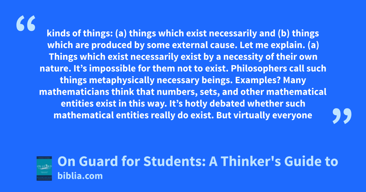kinds of things: (a) things which exist necessarily and (b) things which are produced by some external cause. Let me explain. (a) Things which exist necessarily exist by a necessity of their own nature. It’s impossible for them not to exist. Philosophers call such things metaphysically necessary beings. Examples? Many mathematicians think that numbers, sets, and other mathematical entities exist in this way. It’s hotly debated whether such mathematical entities really do exist. But virtually everyone