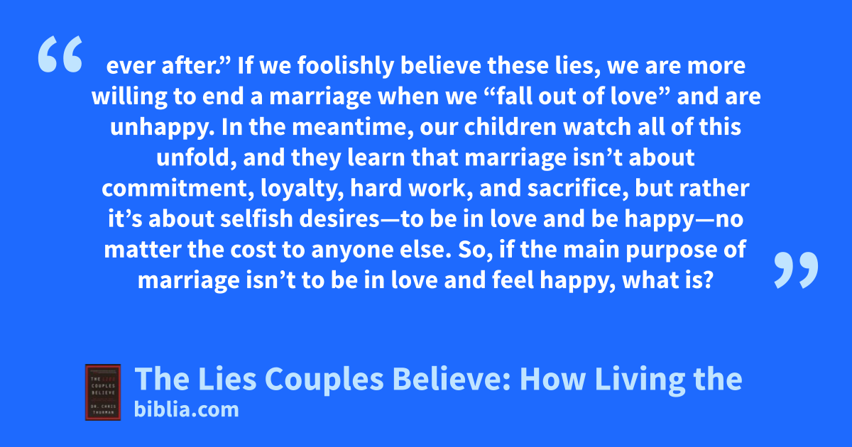 ever after.” If we foolishly believe these lies, we are more willing to end a marriage when we “fall out of love” and are unhappy. In the meantime, our children watch all of this unfold, and they learn that marriage isn’t about commitment, loyalty, hard work, and sacrifice, but rather it’s about selfish desires—to be in love and be happy—no matter the cost to anyone else. So, if the main purpose of marriage isn’t to be in love and feel happy, what is?