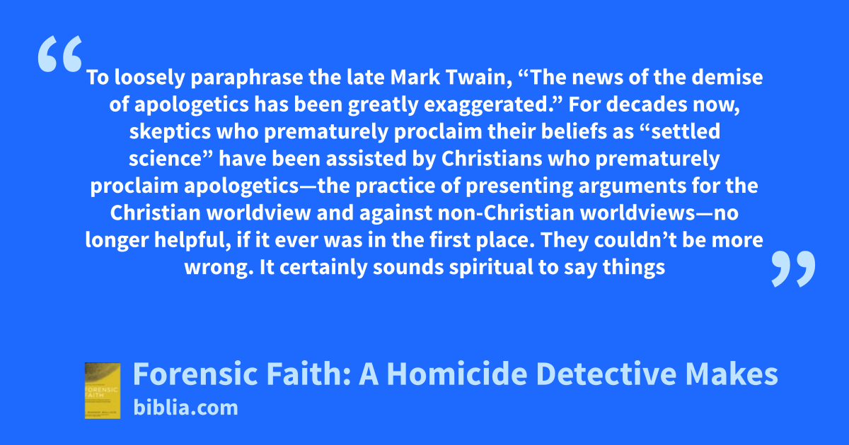 To loosely paraphrase the late Mark Twain, “The news of the demise of apologetics has been greatly exaggerated.” For decades now, skeptics who prematurely proclaim their beliefs as “settled science” have been assisted by Christians who prematurely proclaim apologetics—the practice of presenting arguments for the Christian worldview and against non-Christian worldviews—no longer helpful, if it ever was in the first place. They couldn’t be more wrong. It certainly sounds spiritual to say things