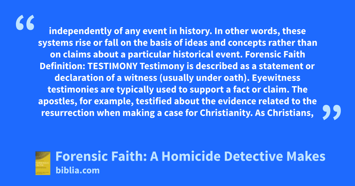 independently of any event in history. In other words, these systems rise or fall on the basis of ideas and concepts rather than on claims about a particular historical event. Forensic Faith Definition: TESTIMONY Testimony is described as a statement or declaration of a witness (usually under oath). Eyewitness testimonies are typically used to support a fact or claim. The apostles, for example, testified about the evidence related to the resurrection when making a case for Christianity. As Christians,