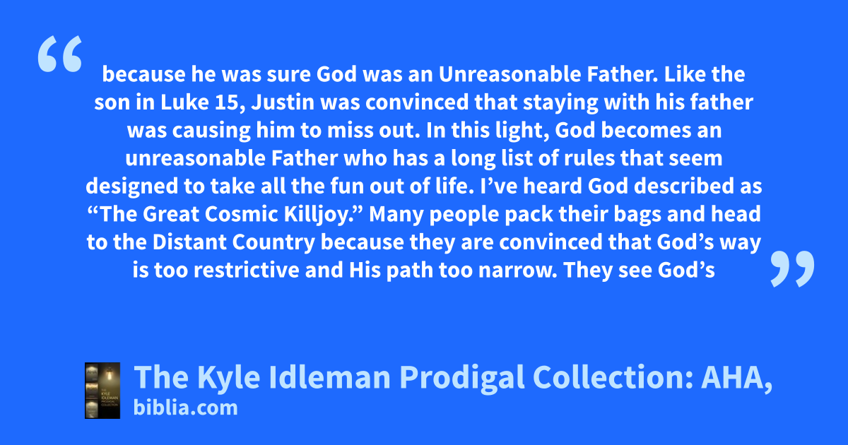 because he was sure God was an Unreasonable Father. Like the son in Luke 15, Justin was convinced that staying with his father was causing him to miss out. In this light, God becomes an unreasonable Father who has a long list of rules that seem designed to take all the fun out of life. I’ve heard God described as “The Great Cosmic Killjoy.” Many people pack their bags and head to the Distant Country because they are convinced that God’s way is too restrictive and His path too narrow. They see God’s