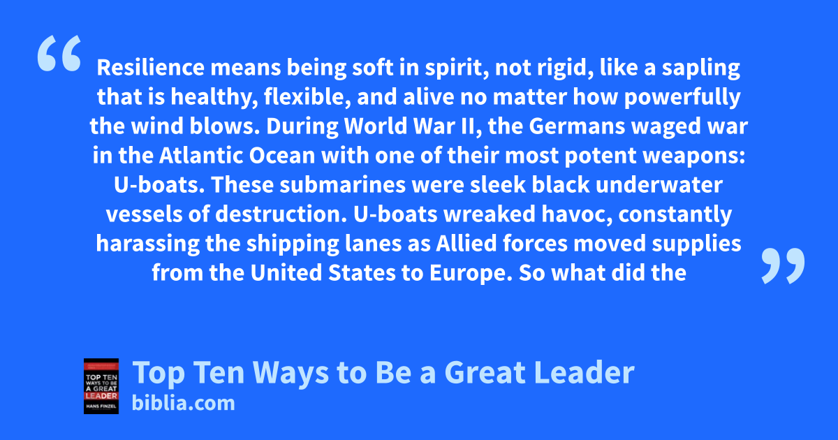 Resilience means being soft in spirit, not rigid, like a sapling that is healthy, flexible, and alive no matter how powerfully the wind blows. During World War II, the Germans waged war in the Atlantic Ocean with one of their most potent weapons: U-boats. These submarines were sleek black underwater vessels of destruction. U-boats wreaked havoc, constantly harassing the shipping lanes as Allied forces moved supplies from the United States to Europe. So what did the