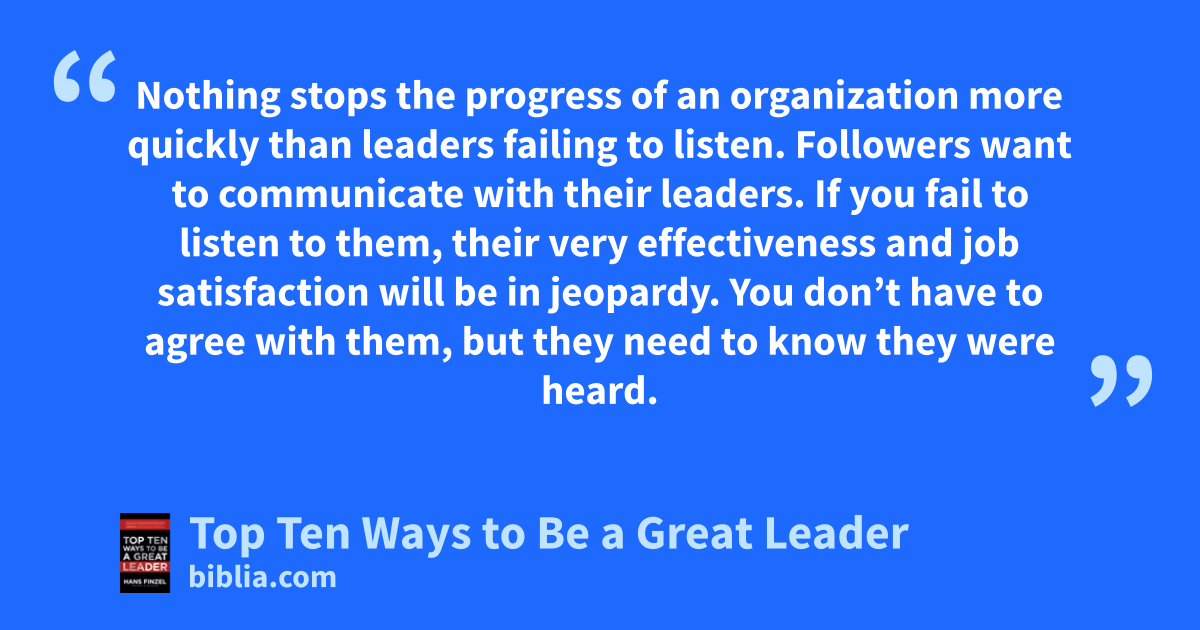 Nothing stops the progress of an organization more quickly than leaders failing to listen. Followers want to communicate with their leaders. If you fail to listen to them, their very effectiveness and job satisfaction will be in jeopardy. You don’t have to agree with them, but they need to know they were heard.