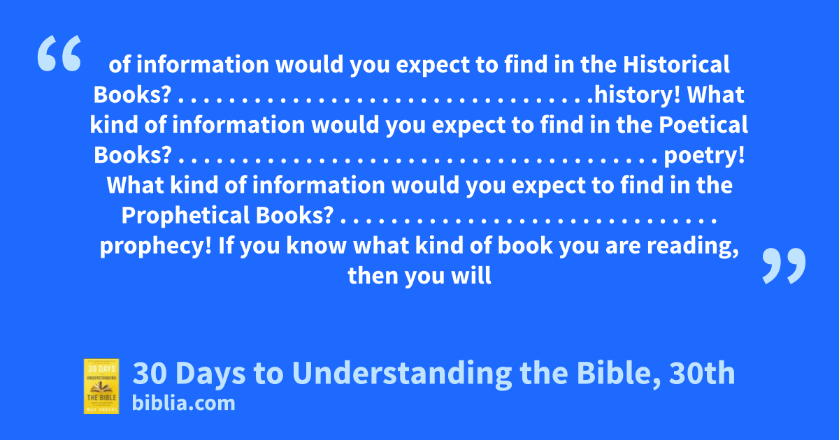 of information would you expect to find in the Historical Books? . . . . . . . . . . . . . . . . . . . . . . . . . . . . . . . . .history! What kind of information would you expect to find in the Poetical Books? . . . . . . . . . . . . . . . . . . . . . . . . . . . . . . . . . . . . . . poetry! What kind of information would you expect to find in the Prophetical Books? . . . . . . . . . . . . . . . . . . . . . . . . . . . . . . prophecy! If you know what kind of book you are reading, then you will