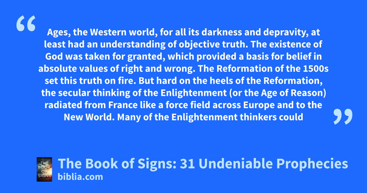Ages, the Western world, for all its darkness and depravity, at least had an understanding of objective truth. The existence of God was taken for granted, which provided a basis for belief in absolute values of right and wrong. The Reformation of the 1500s set this truth on fire. But hard on the heels of the Reformation, the secular thinking of the Enlightenment (or the Age of Reason) radiated from France like a force field across Europe and to the New World. Many of the Enlightenment thinkers could