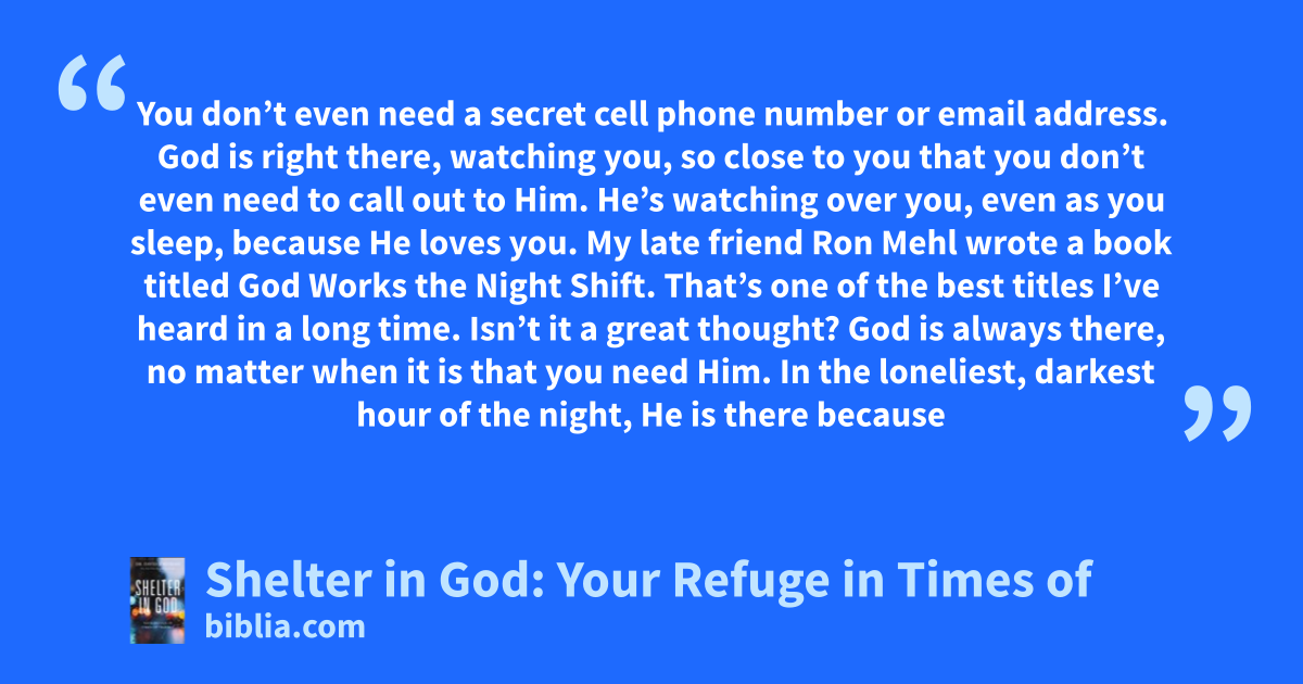 You don’t even need a secret cell phone number or email address. God is right there, watching you, so close to you that you don’t even need to call out to Him. He’s watching over you, even as you sleep, because He loves you. My late friend Ron Mehl wrote a book titled God Works the Night Shift. That’s one of the best titles I’ve heard in a long time. Isn’t it a great thought? God is always there, no matter when it is that you need Him. In the loneliest, darkest hour of the night, He is there because