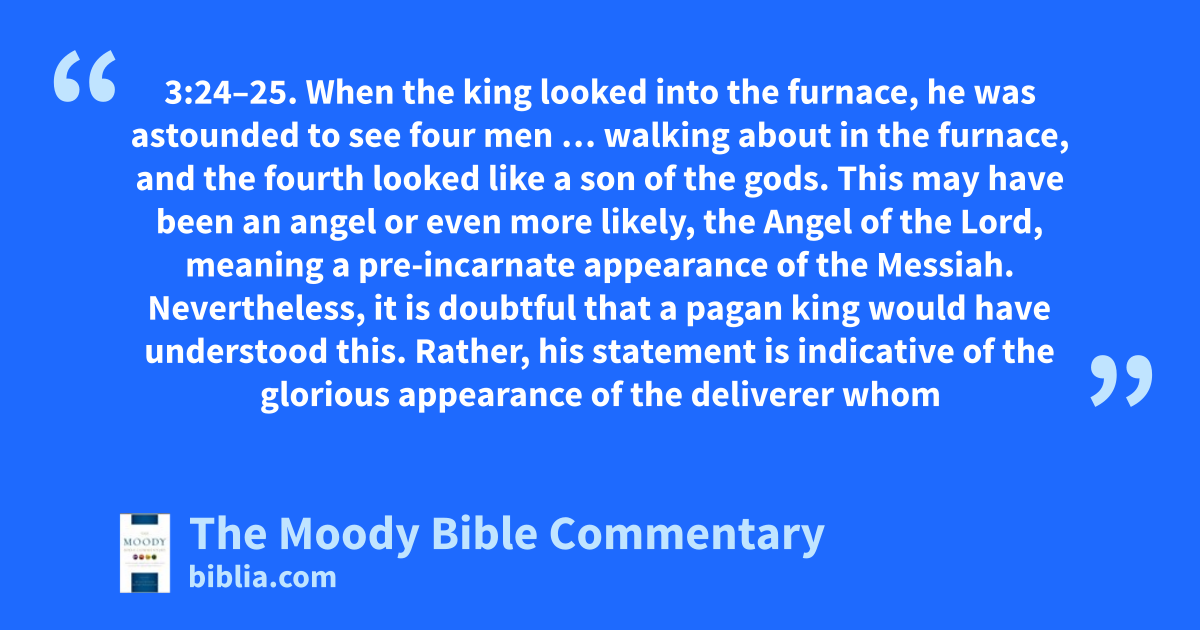 3:24–25. When the king looked into the furnace, he was astounded to see four men … walking about in the furnace, and the fourth looked like a son of the gods. This may have been an angel or even more likely, the Angel of the Lord, meaning a pre-incarnate appearance of the Messiah. Nevertheless, it is doubtful that a pagan king would have understood this. Rather, his statement is indicative of the glorious appearance of the deliverer whom