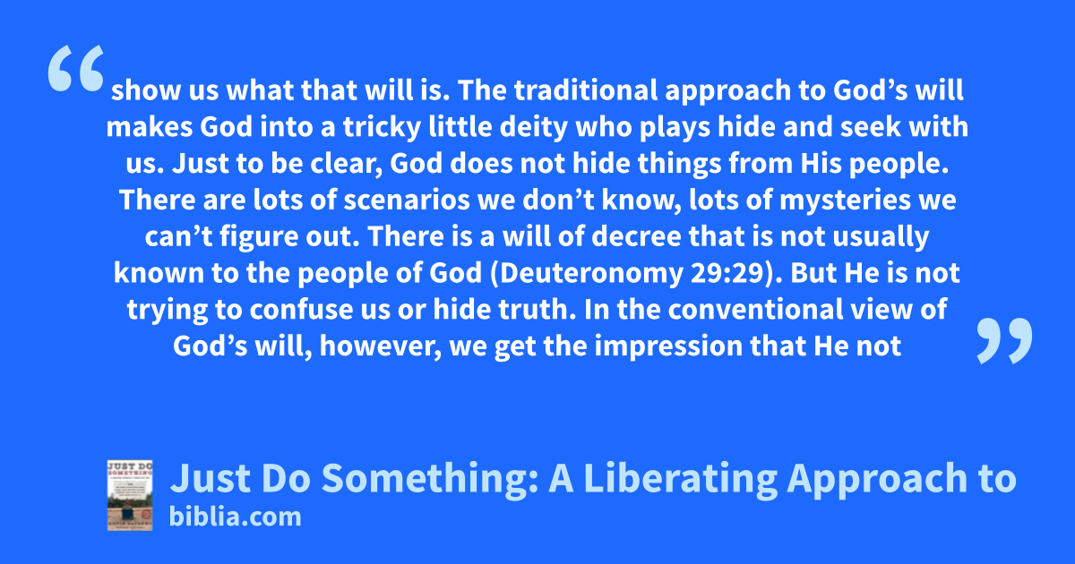 show us what that will is. The traditional approach to God’s will makes God into a tricky little deity who plays hide and seek with us. Just to be clear, God does not hide things from His people. There are lots of scenarios we don’t know, lots of mysteries we can’t figure out. There is a will of decree that is not usually known to the people of God (Deuteronomy 29:29). But He is not trying to confuse us or hide truth. In the conventional view of God’s will, however, we get the impression that He not