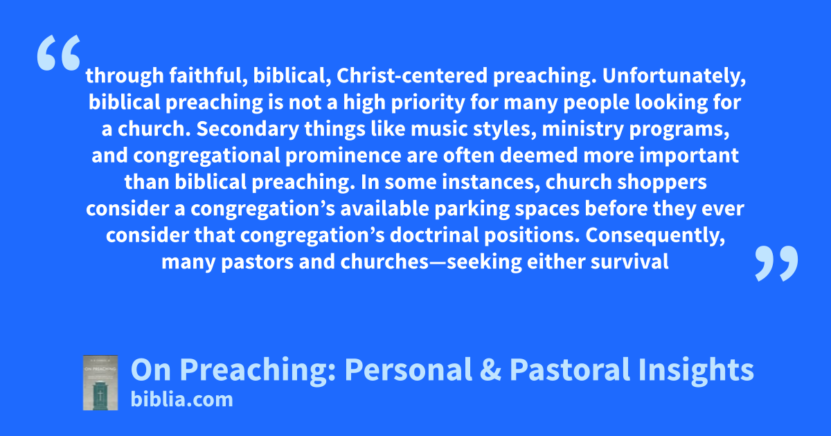 through faithful, biblical, Christ-centered preaching. Unfortunately, biblical preaching is not a high priority for many people looking for a church. Secondary things like music styles, ministry programs, and congregational prominence are often deemed more important than biblical preaching. In some instances, church shoppers consider a congregation’s available parking spaces before they ever consider that congregation’s doctrinal positions. Consequently, many pastors and churches—seeking either survival