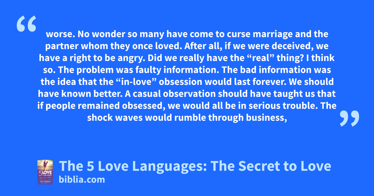 worse. No wonder so many have come to curse marriage and the partner whom they once loved. After all, if we were deceived, we have a right to be angry. Did we really have the “real” thing? I think so. The problem was faulty information. The bad information was the idea that the “in-love” obsession would last forever. We should have known better. A casual observation should have taught us that if people remained obsessed, we would all be in serious trouble. The shock waves would rumble through business,