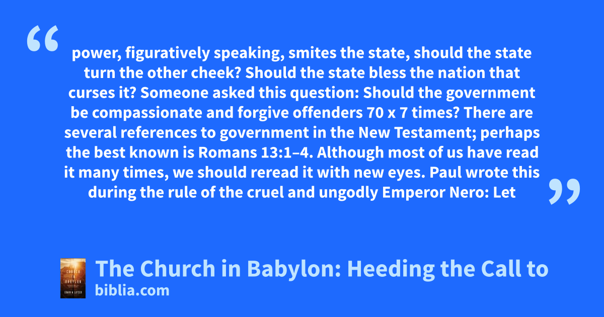 power, figuratively speaking, smites the state, should the state turn the other cheek? Should the state bless the nation that curses it? Someone asked this question: Should the government be compassionate and forgive offenders 70 x 7 times? There are several references to government in the New Testament; perhaps the best known is Romans 13:1–4. Although most of us have read it many times, we should reread it with new eyes. Paul wrote this during the rule of the cruel and ungodly Emperor Nero: Let